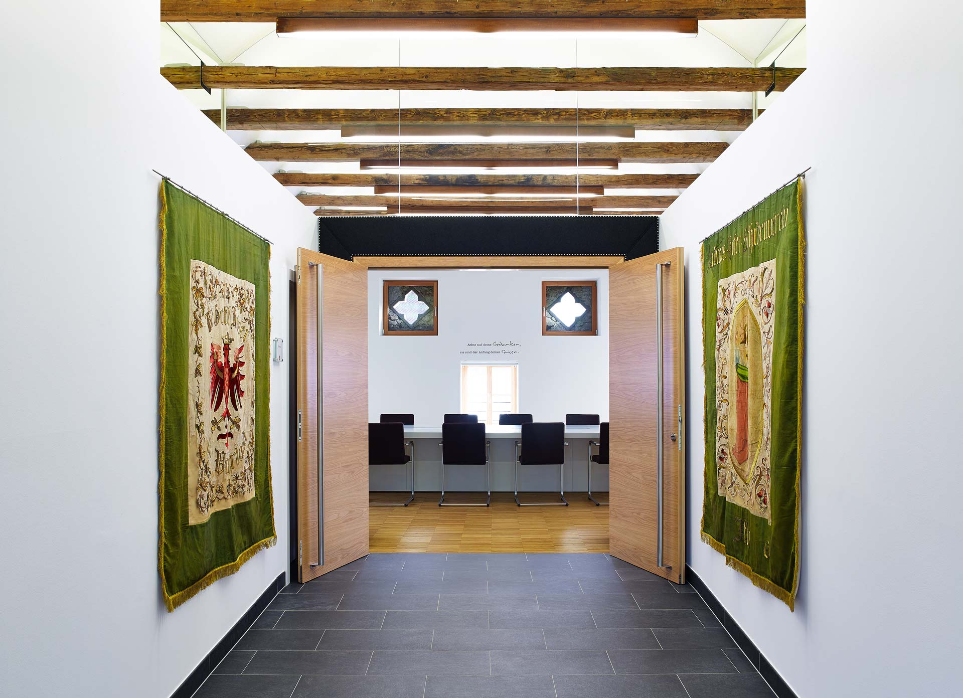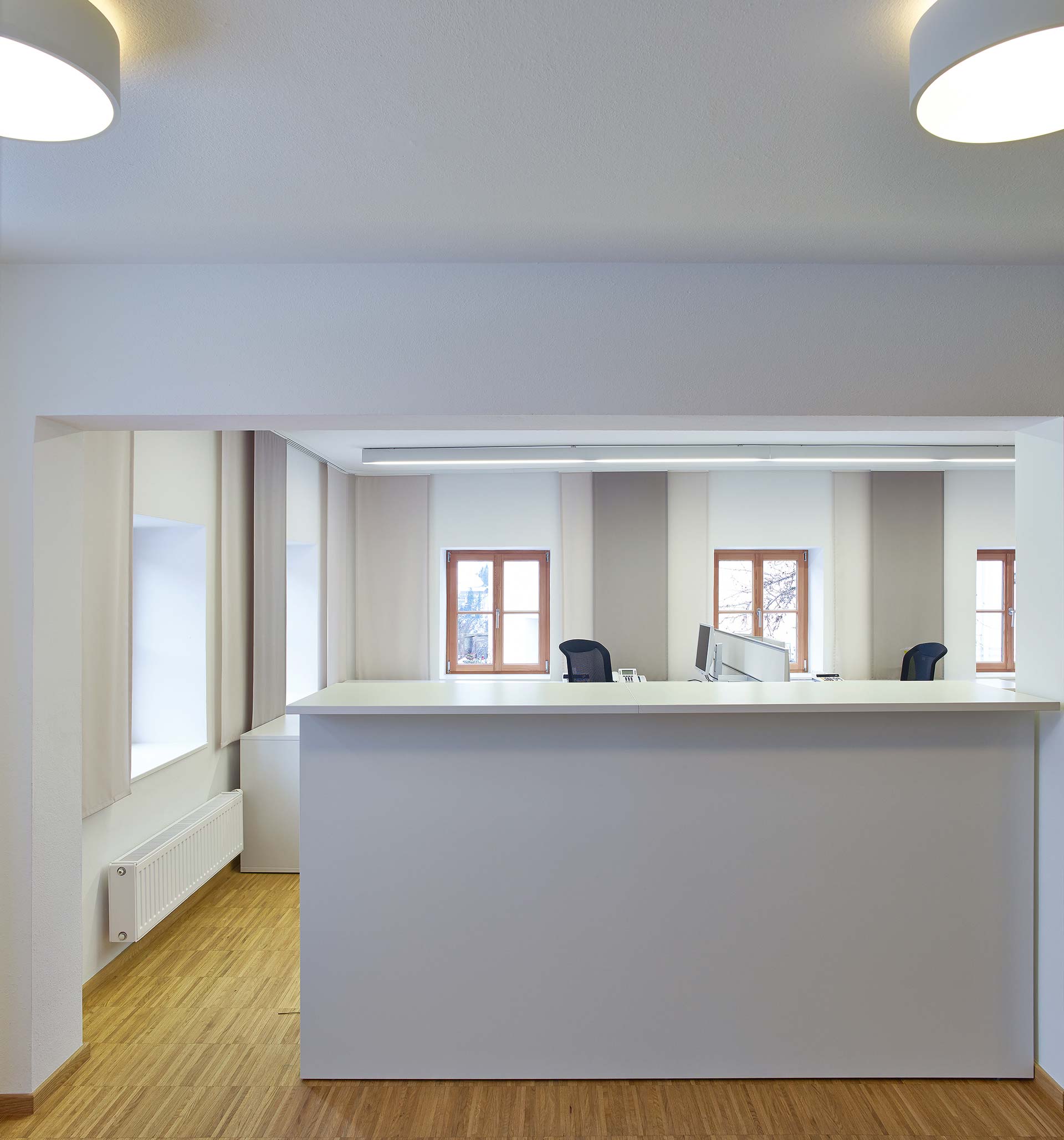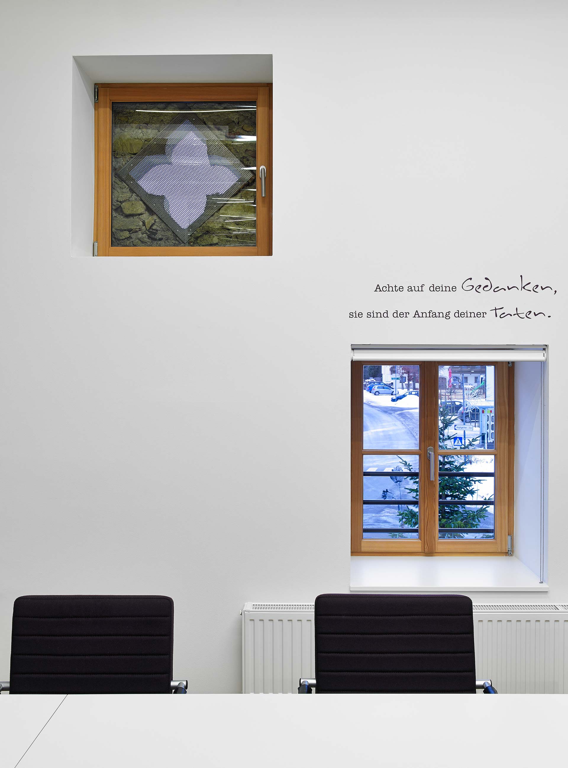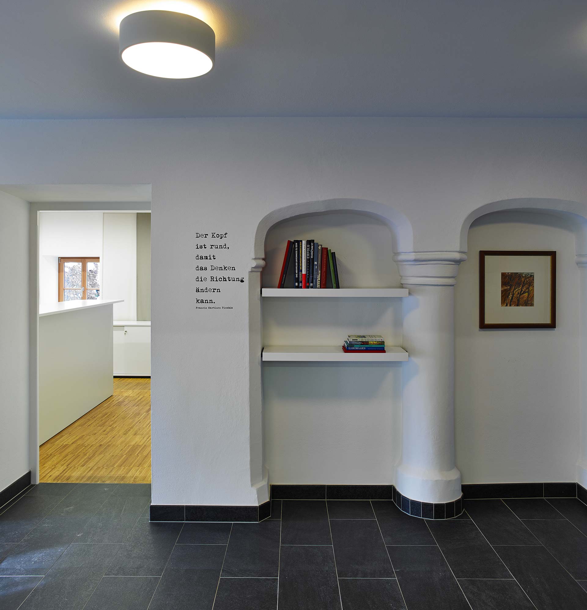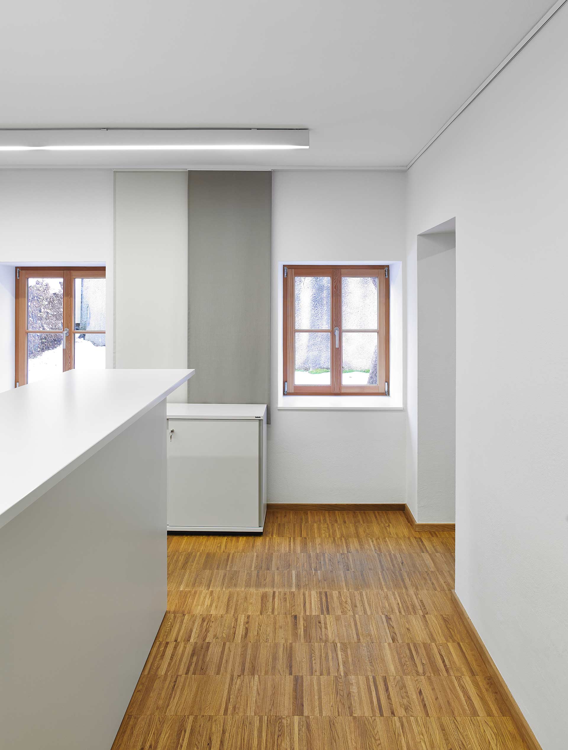 Planung und Auswahl des gesamten Interieurs, Beleuchtung, Bodenbeläge, Wandbeschichtungen, Textilien. Organisation der Restaurierung von bestehendem Mobiliar, Auswahl und Positionierung der gemeindeeigenen Bilder, Wand- Beschichtungen und textile Beschattung. Raumgestaltungs- Konzept: Zeitgemäße Formensprache bei der Entwicklung des Interieurs, umgesetzt in Verbundstoff- Materialien bei den Serienmöbeln, kombiniert mit handwerklich gefertigten Möbeln in heimischen Eichenholz, Bodenflächen in geöltem Industrieparkett, Feinsteinzeug in den Gängen, Fliesen in den Sanitäranlagen. Ausarbeitung des Personenleitsystems. Erstellung des gesamten Oberflächenstruktur- und Farbkonzeptes für alle Räume und Einrichtungen. Örtliche Bauüberwachung mit Qualitäts- und Kostenkontrolle für oben genannten Leistungen.