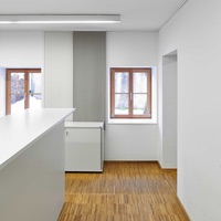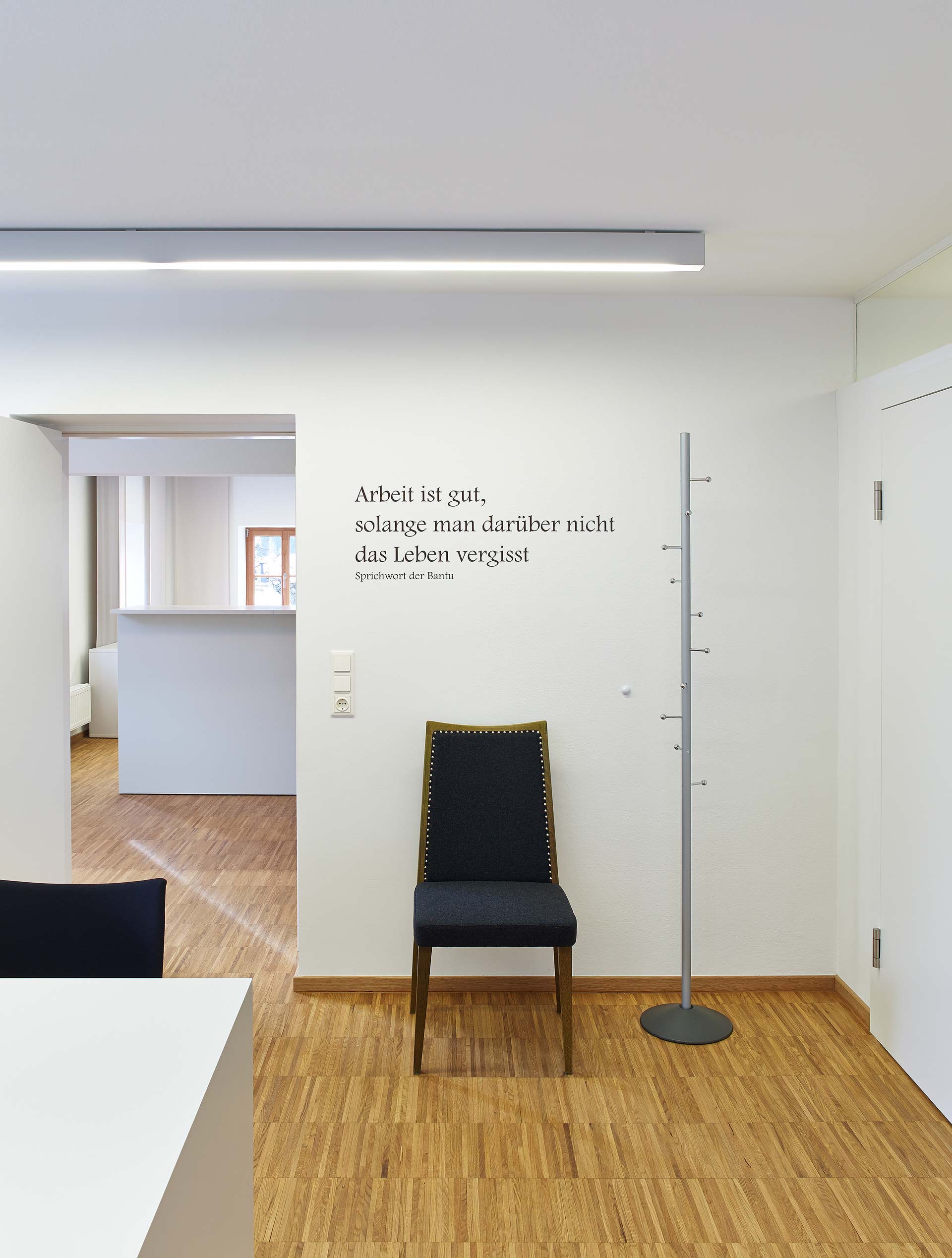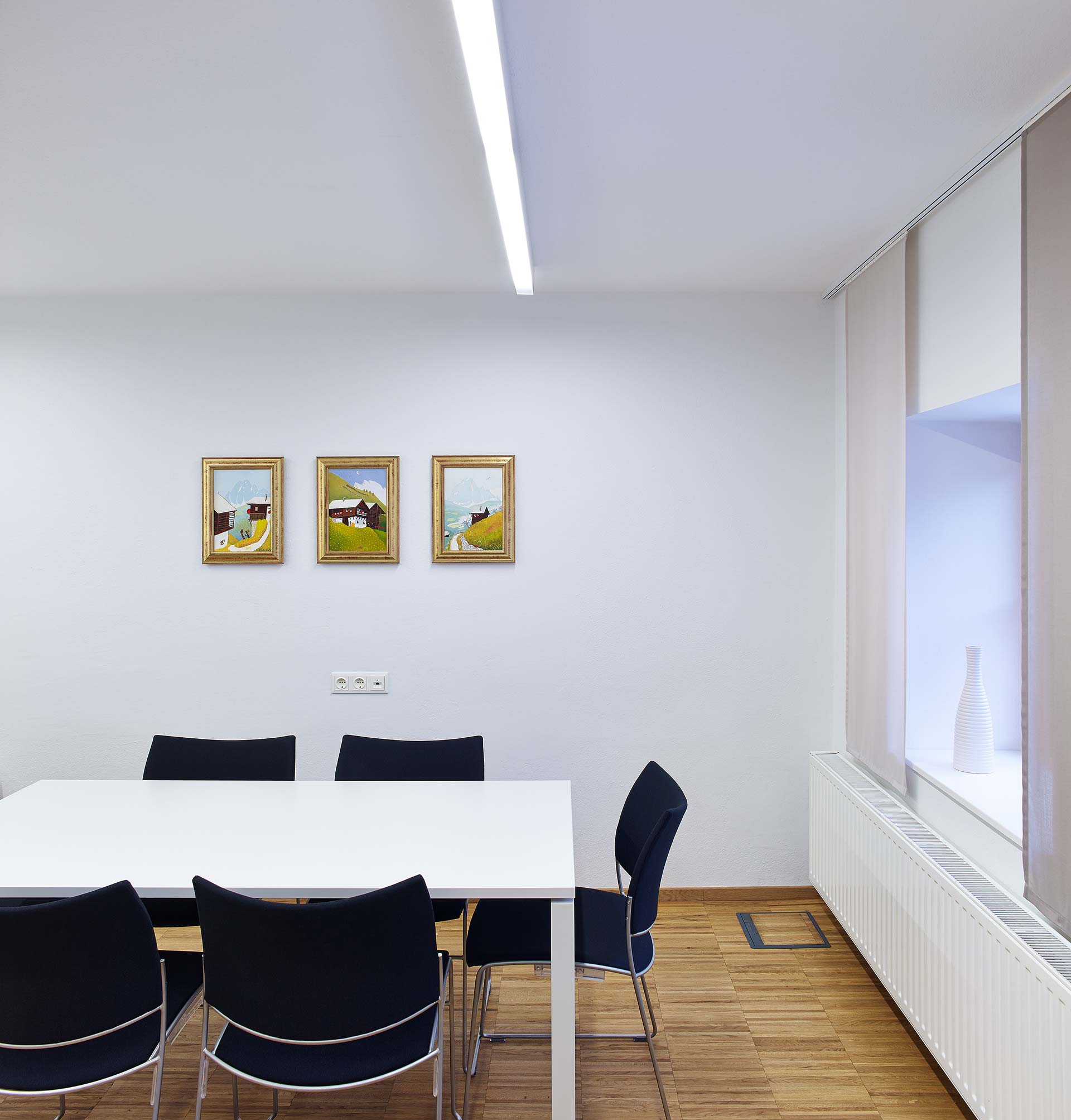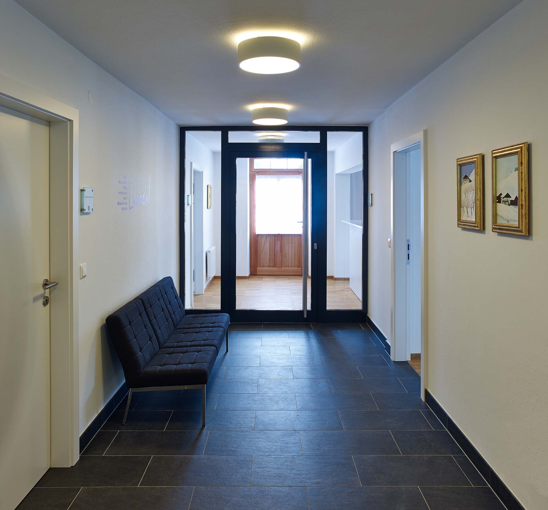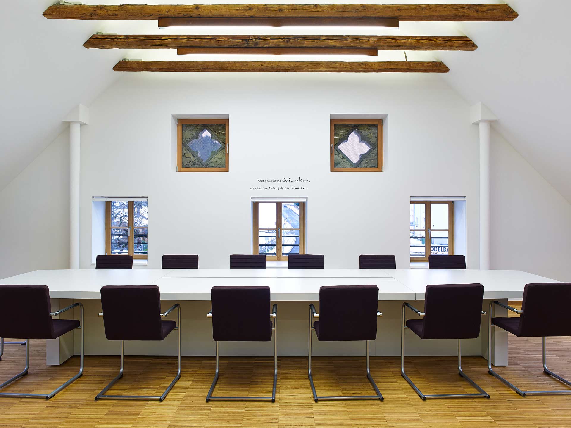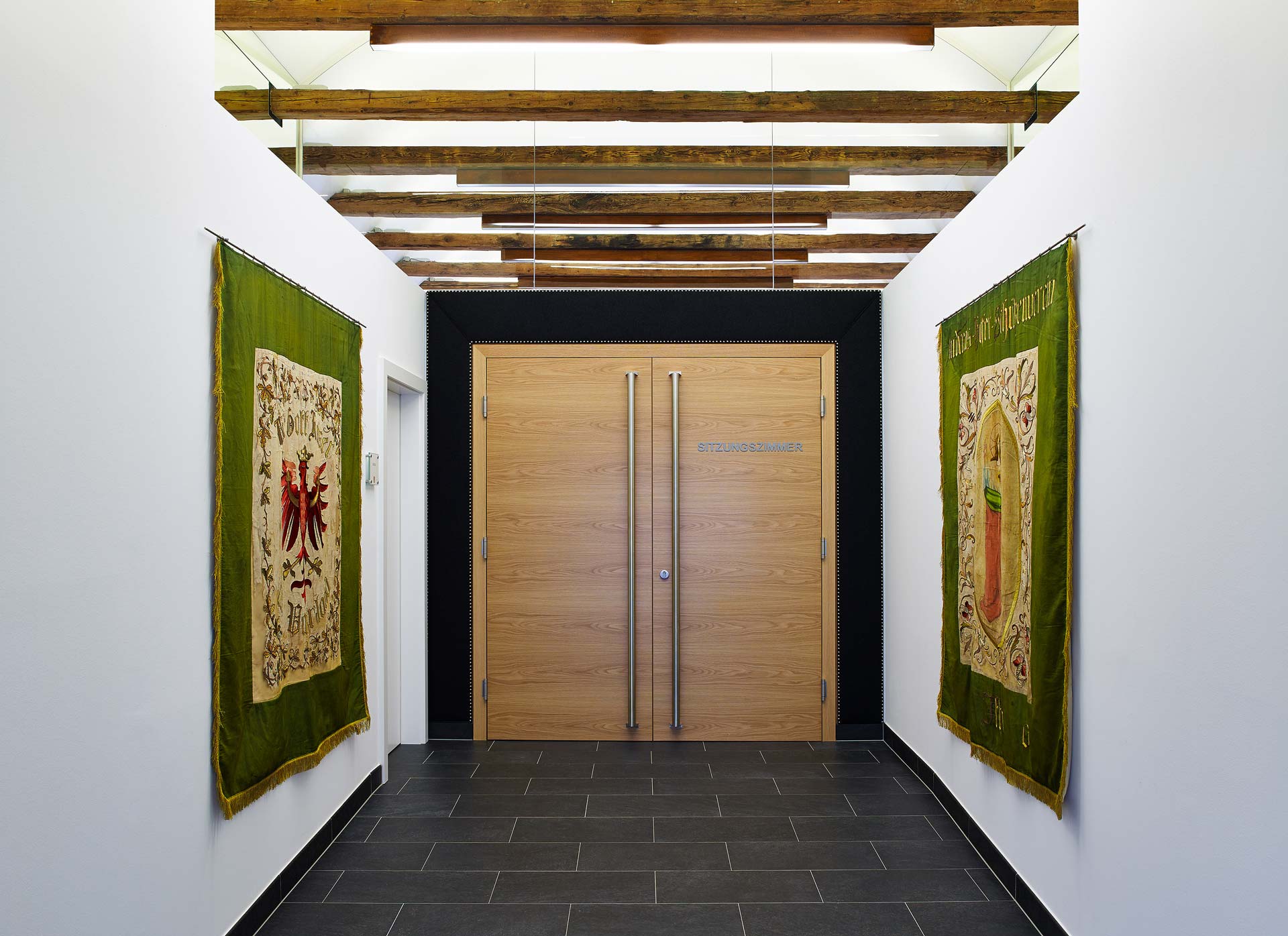 Planung und Auswahl des gesamten Interieurs, Beleuchtung, Bodenbeläge, Wandbeschichtungen, Textilien. Organisation der Restaurierung von bestehendem Mobiliar, Auswahl und Positionierung der gemeindeeigenen Bilder, Wand- Beschichtungen und textile Beschattung. Raumgestaltungs- Konzept: Zeitgemäße Formensprache bei der Entwicklung des Interieurs, umgesetzt in Verbundstoff- Materialien bei den Serienmöbeln, kombiniert mit handwerklich gefertigten Möbeln in heimischen Eichenholz, Bodenflächen in geöltem Industrieparkett, Feinsteinzeug in den Gängen, Fliesen in den Sanitäranlagen. Ausarbeitung des Personenleitsystems. Erstellung des gesamten Oberflächenstruktur- und Farbkonzeptes für alle Räume und Einrichtungen. Örtliche Bauüberwachung mit Qualitäts- und Kostenkontrolle für oben genannten Leistungen.