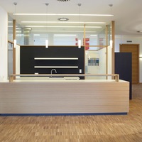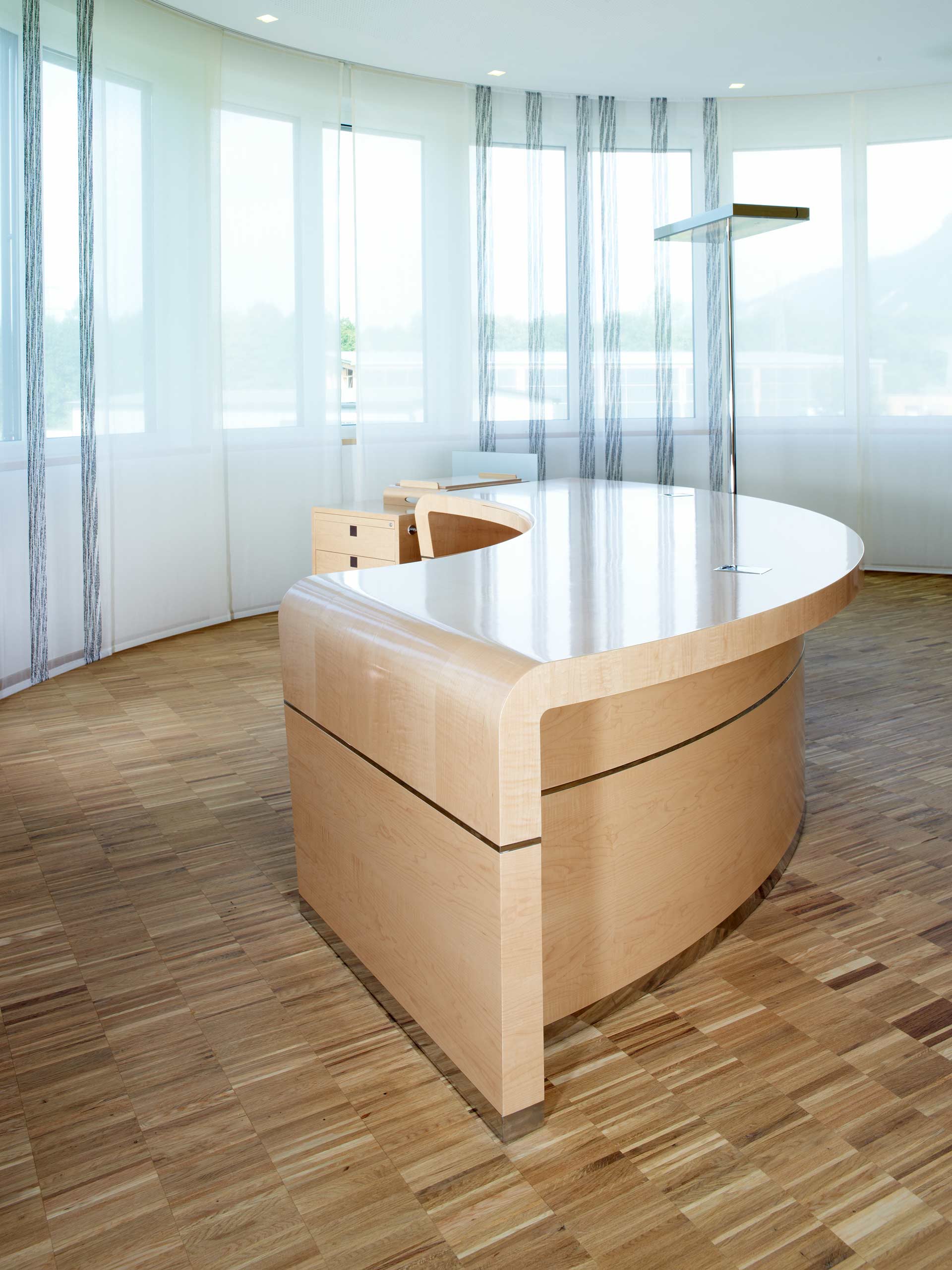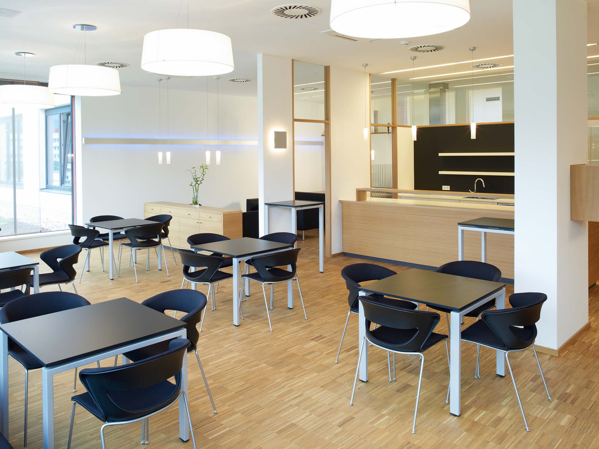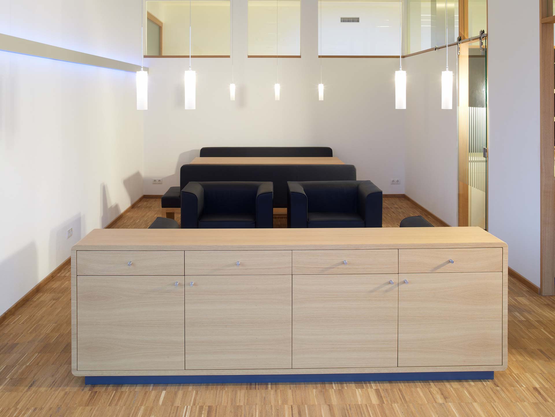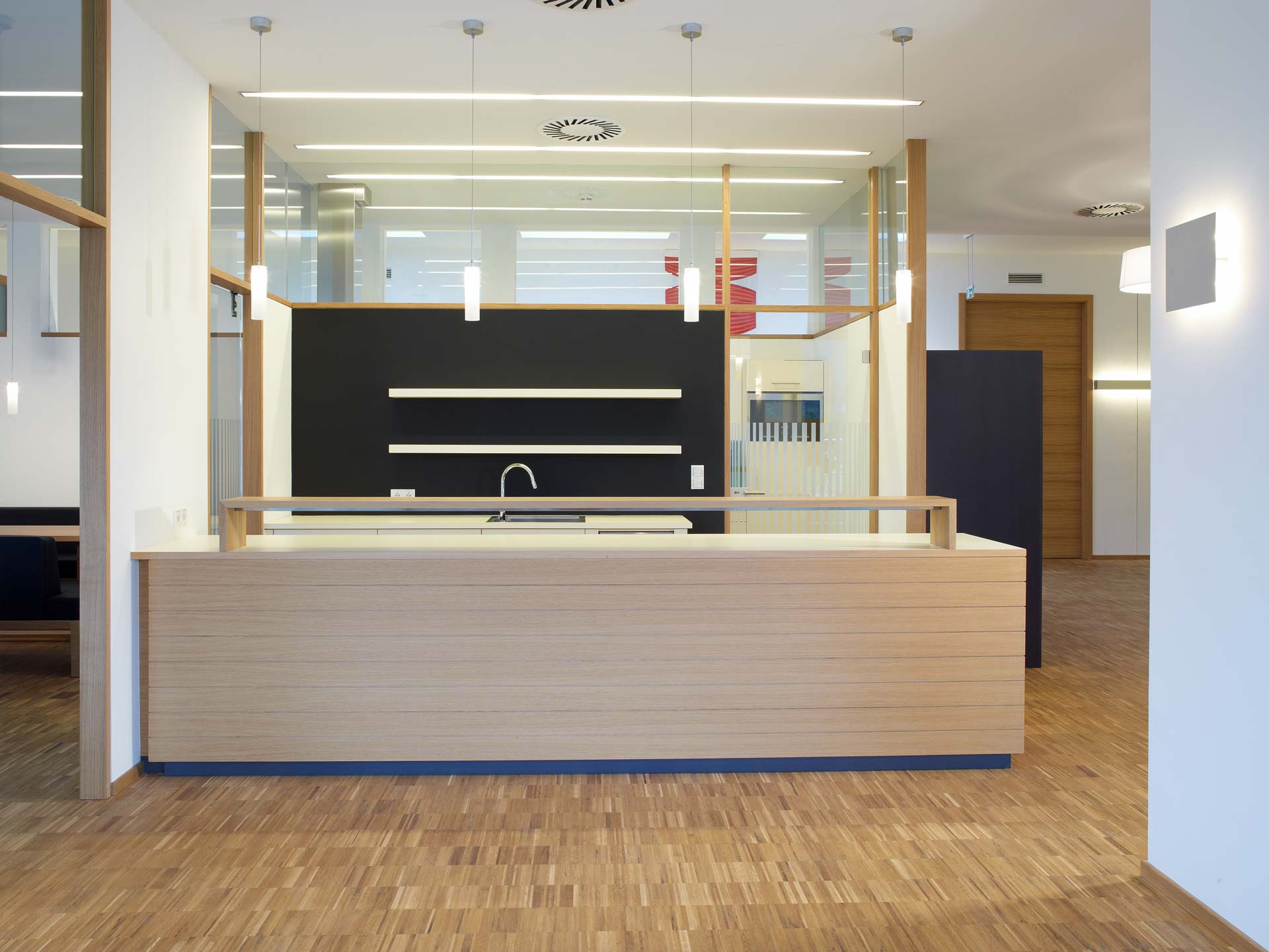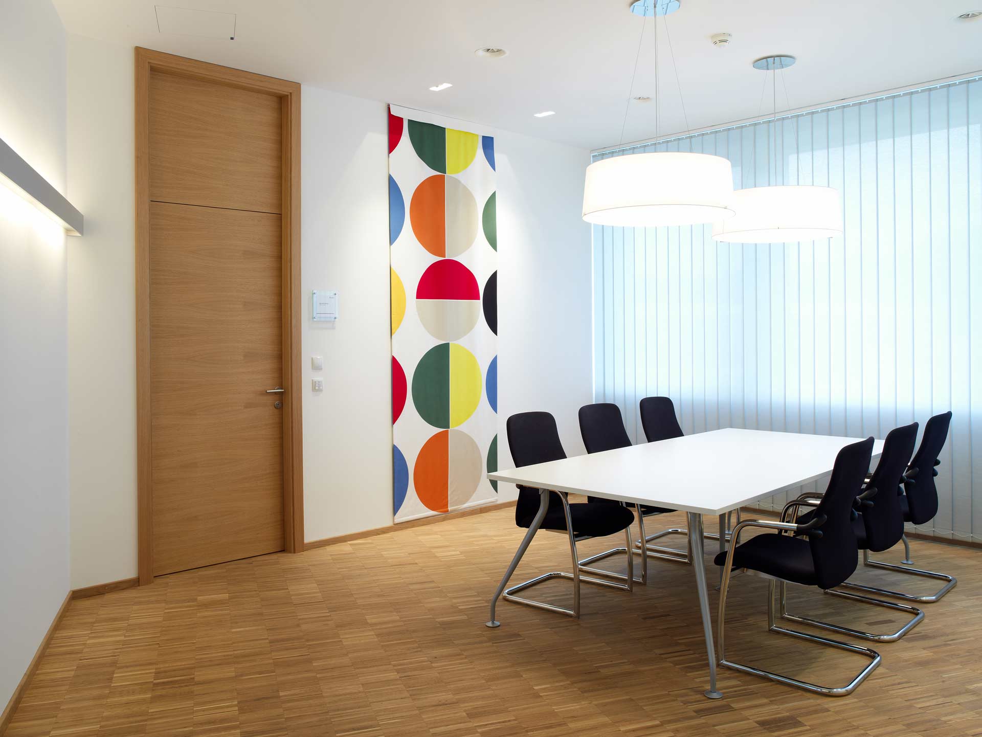 Das TB wurde nach Fertigstellung des Roh-Baues mit der Innenarchitektur beauftragt. Die großen, hohen Räumlichkeiten sollten natürliches Licht erhalten. So wurde der Einbau von Tageslicht-Kuppeln entschieden. Raumhohe Innentüren mit verglasten Oberlichten verbessern zusätzlich die natürliche Lichtsituation in den Gängen. Folgende Bodenbeläge kamen zur Ausführung: Eiche-Industrie-Parkett in Sitzungsraum, Cafeteria, Gängen und Stiegen-Haus, Schiefer im Foyer und Teppichböden in den Büros. Die Einrichtung der repräsentativen Räume wurde individuell geplant und nach Maß in Eiche gefertigt. Alle sichtbaren Haustechnik-Abdeckungen, Steuerungen und Lüftungsgitter wurden in Abstimmung mit der Beleuchtung positioniert. Die Ausleuchtung der Gänge erfolgte indirekt, mit speziell entworfenen Leuchtleisten, in den öffentlichen Räumen wurden zusätzlich dekorative Leuchten eingesetzt. Große Wand-Paneaus aus Natur-Baumwolle mit verschiedensten Drucken wurden zur Verfeinerung der Akustik aufgehängt.