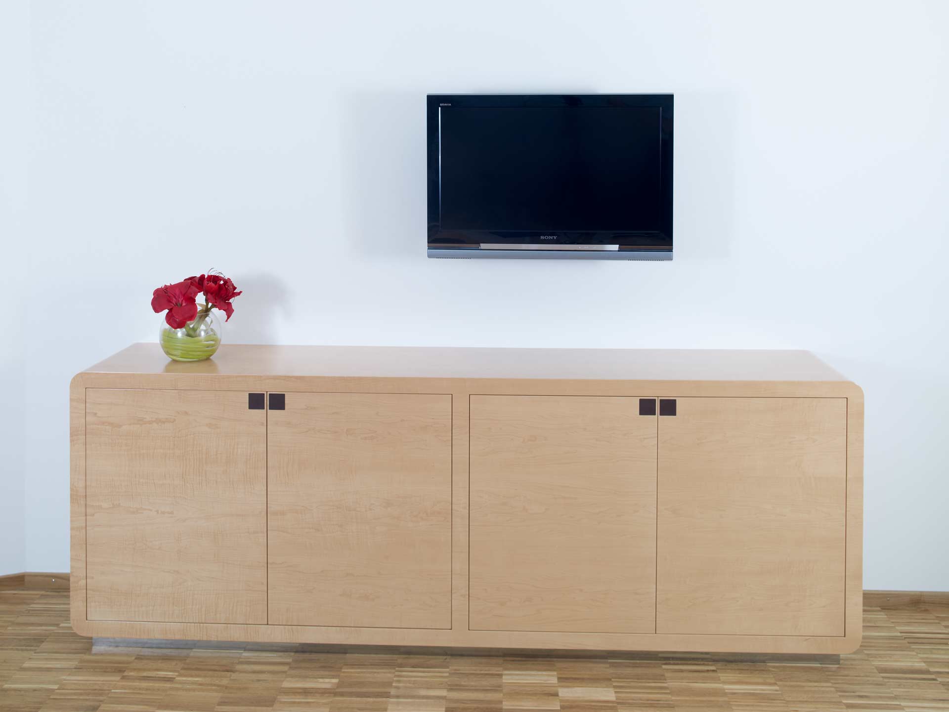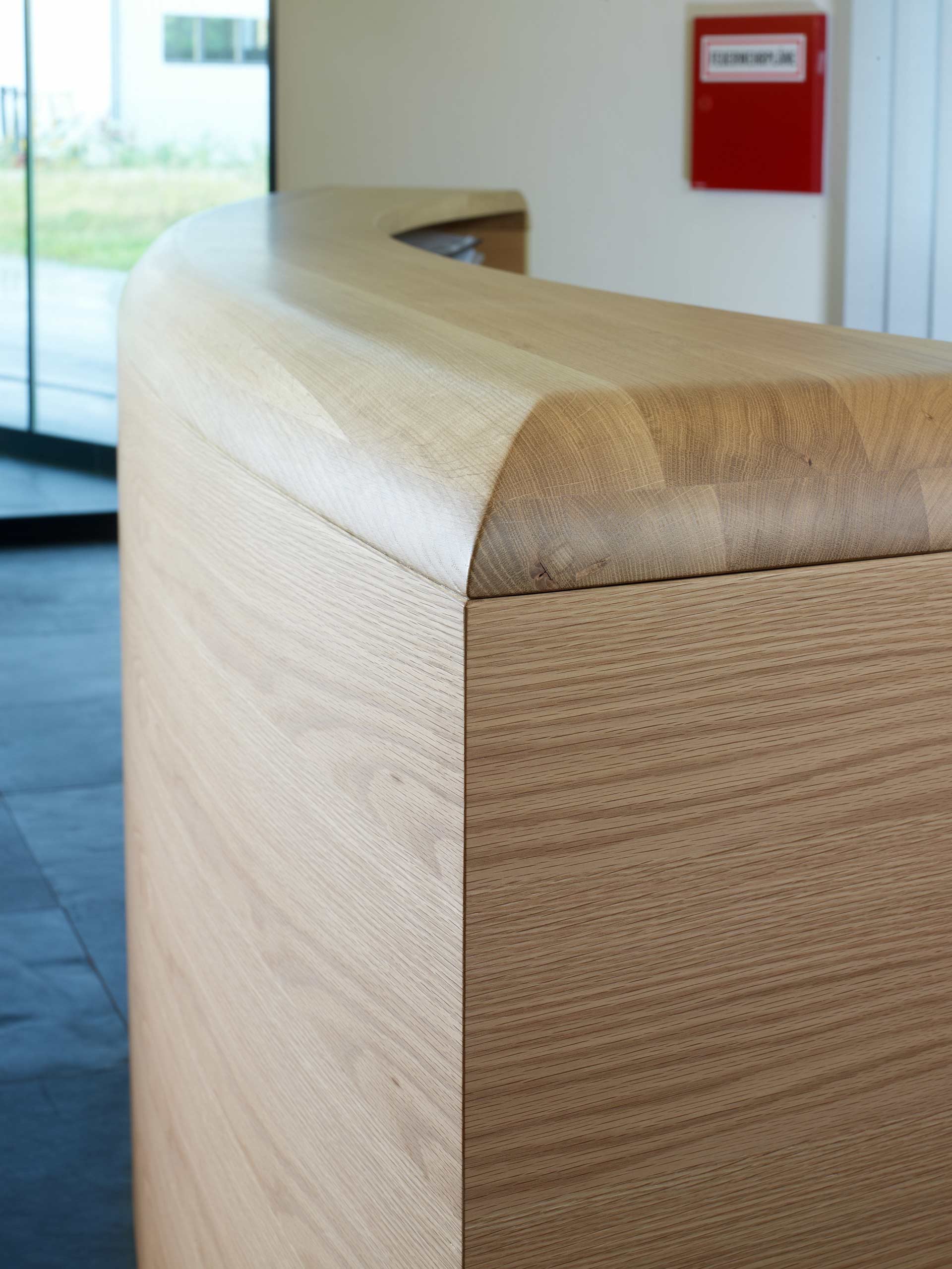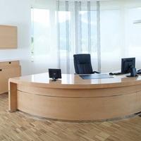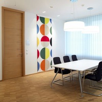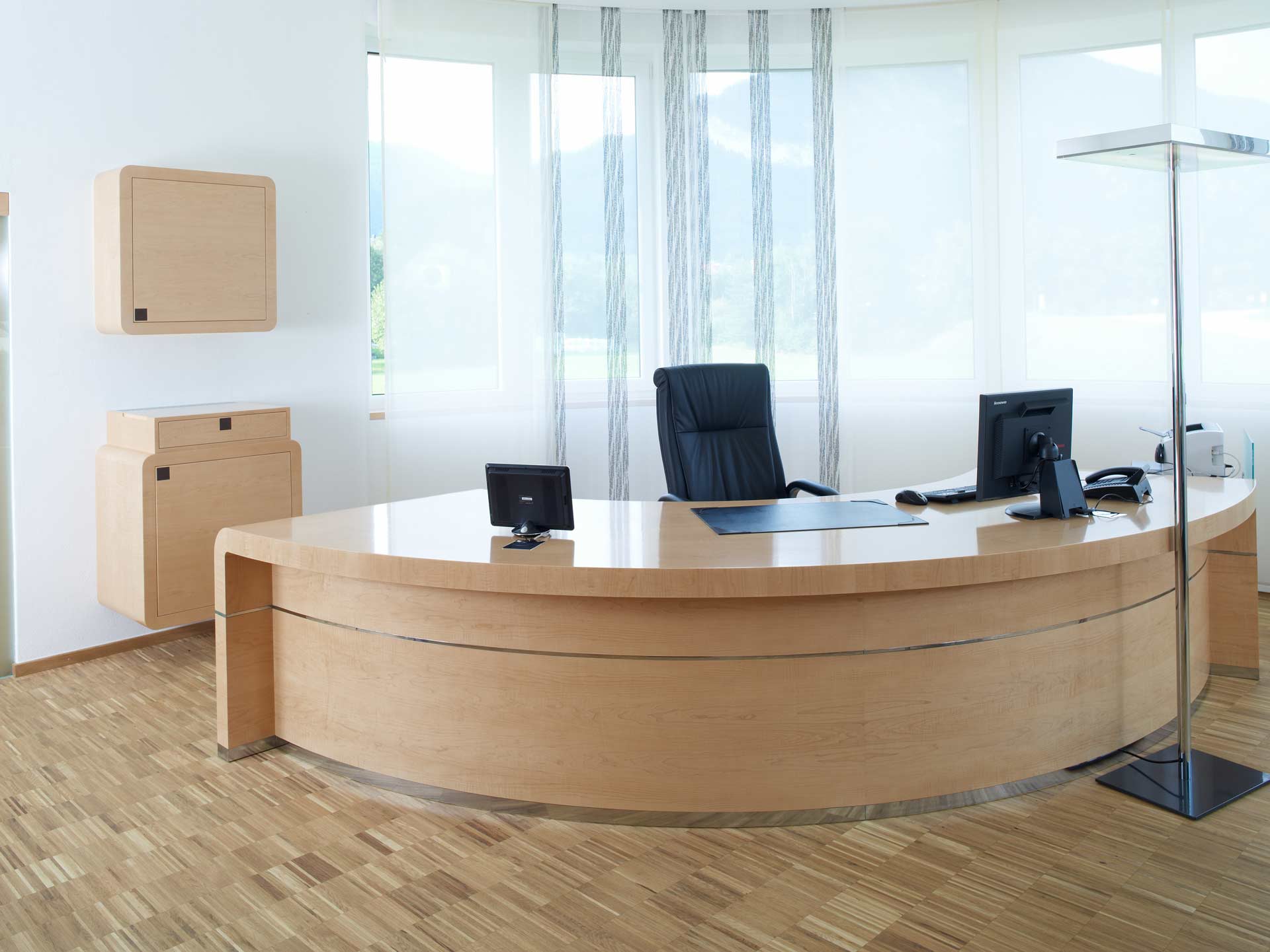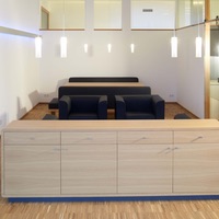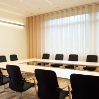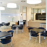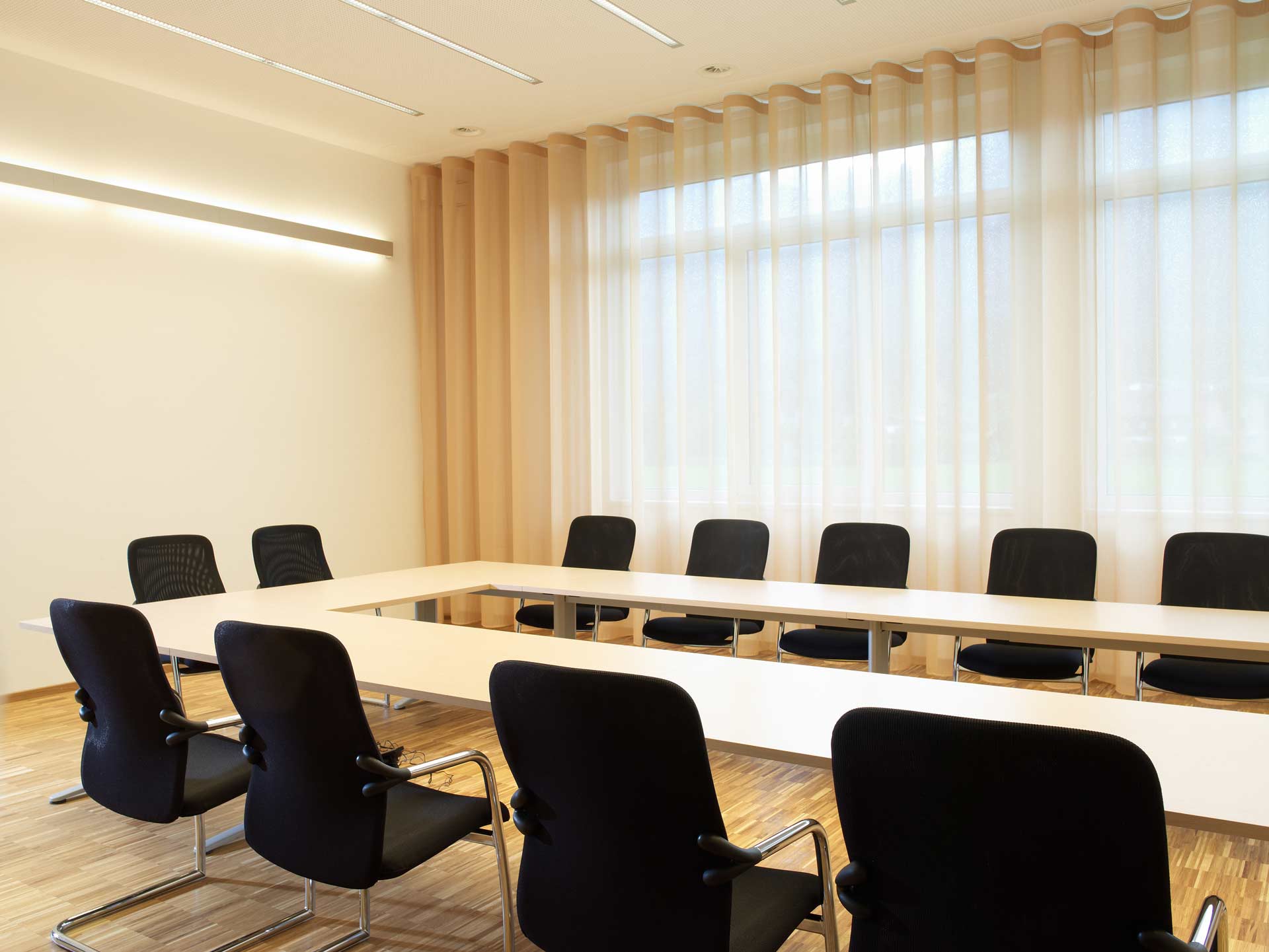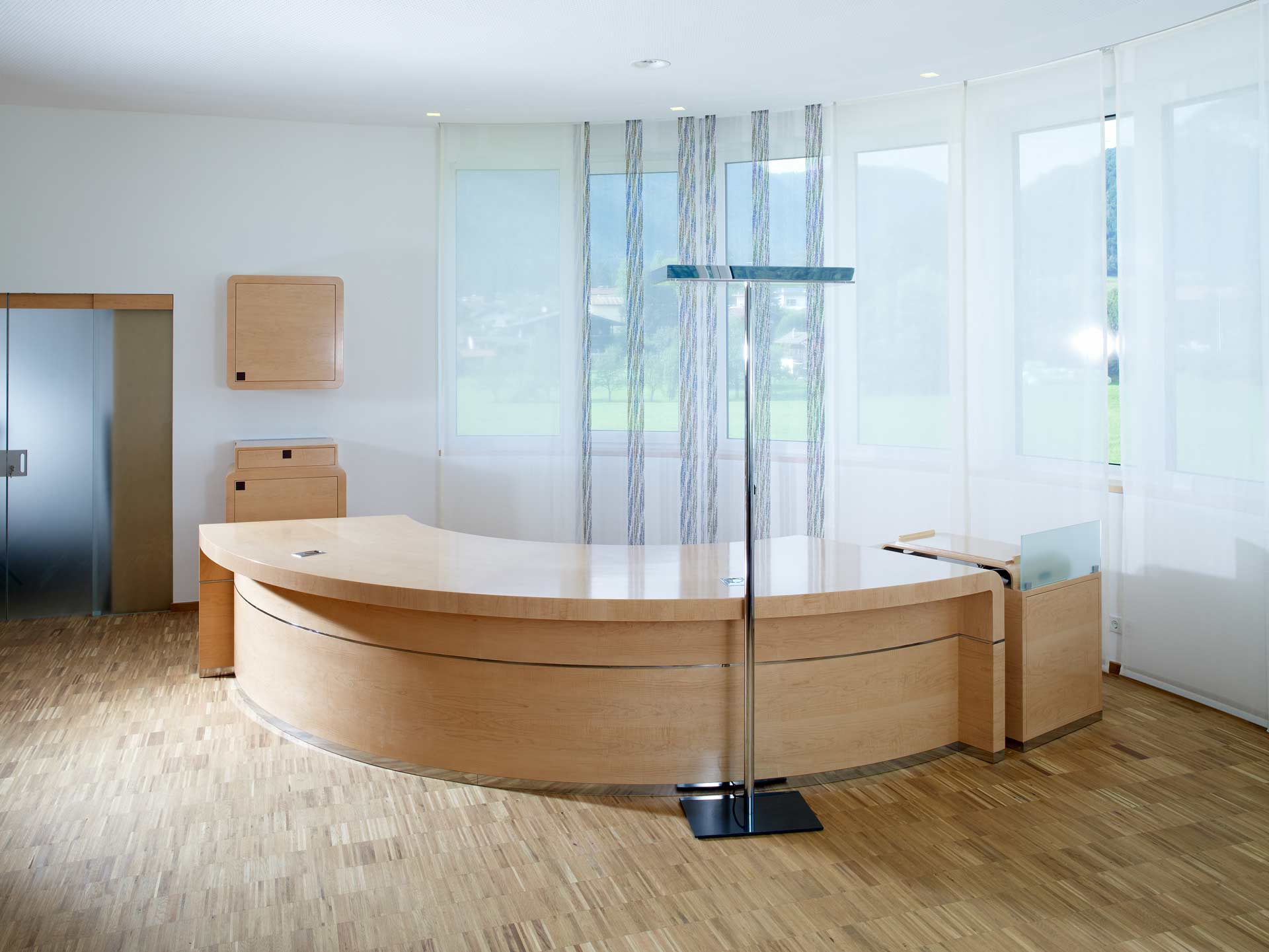 Das TB wurde nach Fertigstellung des Roh-Baues mit der Innenarchitektur beauftragt. Die großen, hohen Räumlichkeiten sollten natürliches Licht erhalten. So wurde der Einbau von Tageslicht-Kuppeln entschieden. Raumhohe Innentüren mit verglasten Oberlichten verbessern zusätzlich die natürliche Lichtsituation in den Gängen. Folgende Bodenbeläge kamen zur Ausführung: Eiche-Industrie-Parkett in Sitzungsraum, Cafeteria, Gängen und Stiegen-Haus, Schiefer im Foyer und Teppichböden in den Büros. Die Einrichtung der repräsentativen Räume wurde individuell geplant und nach Maß in Eiche gefertigt. Alle sichtbaren Haustechnik-Abdeckungen, Steuerungen und Lüftungsgitter wurden in Abstimmung mit der Beleuchtung positioniert. Die Ausleuchtung der Gänge erfolgte indirekt, mit speziell entworfenen Leuchtleisten, in den öffentlichen Räumen wurden zusätzlich dekorative Leuchten eingesetzt. Große Wand-Paneaus aus Natur-Baumwolle mit verschiedensten Drucken wurden zur Verfeinerung der Akustik aufgehängt.